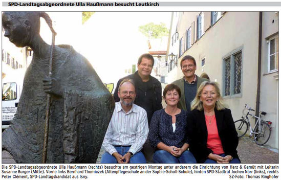 LEUTKIRCH(ri) - Die Sprecherin für Sozial- und Gesundheitspolitik im Landtag, Ulla Haußmann (SPD), hat gestern Leutkirch besucht. Zunächst informierte sie sich über das Projekt Herz & Gemüt, anschließend ging’s zum Kindergarten Piepmatz.