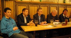 auf dem Podium (v.l.n.r.): Simon Schrade, Dr. Michael C. Hermann, Rainer Willibald, Rudolf Bindig, Jörg Bogenrieder